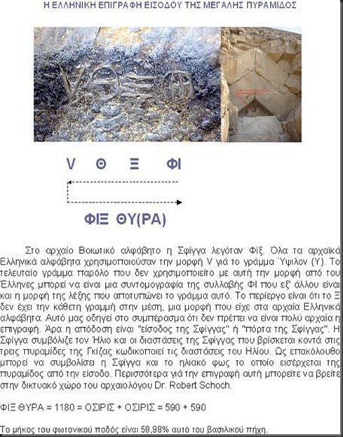 -Ακόμα ο Παρθενώνας που είναι το ΤΕΛΕΙΟΤΕΡΟ οικοδόμημα που κατασκεύασε ΑΝΘΡΩΠΙΝΟ ΧΕΡΙ, αν προεκτείνουμε τις πλευρές του ναού προς τον ουρανό, αυτοί σχηματίζουν μια ΚΟΛΟΥΡΗ ΠΥΡΑΜΙΔΑ, που αν την κυβίσουμε θα βρούμε έκπληκτοι, ότι ο όγκος της είναι ΙΔΙΟΣ με τον όγκο της μεγάλης πυραμίδας στη χώρα του Νείλου!!! Άραγε γιατί αυτή η σχέση; Κάτω η φώτο δείχνει στην εισόδου της Μεγάλης Πυραμίδας την Ελληνική επιγραφή ΦΙΞ ΘΥΡΑ. Είσοδος δηλαδή της Σφίγγας. Δηλαδή θύρα της σοφίας.